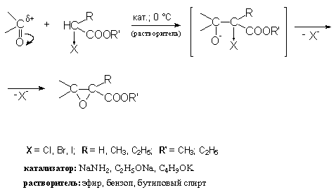 Реакция заключается в конденсации альдегидов и кетонов со сложными эфирами a-галогензамещенных алифатических карбоновых кислот и с a-галогенкетонами в присутствии спиртовых растворов алкоголятов щелочных металлов.