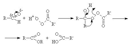 В этой реакции (перегруппировка Байера-Виллигера) вначале происходит нуклеофильное присоединение аниона пероксикарбоновой кислоты к карбонильной группе, после чего следует внутримолекулярная перегруппировка: